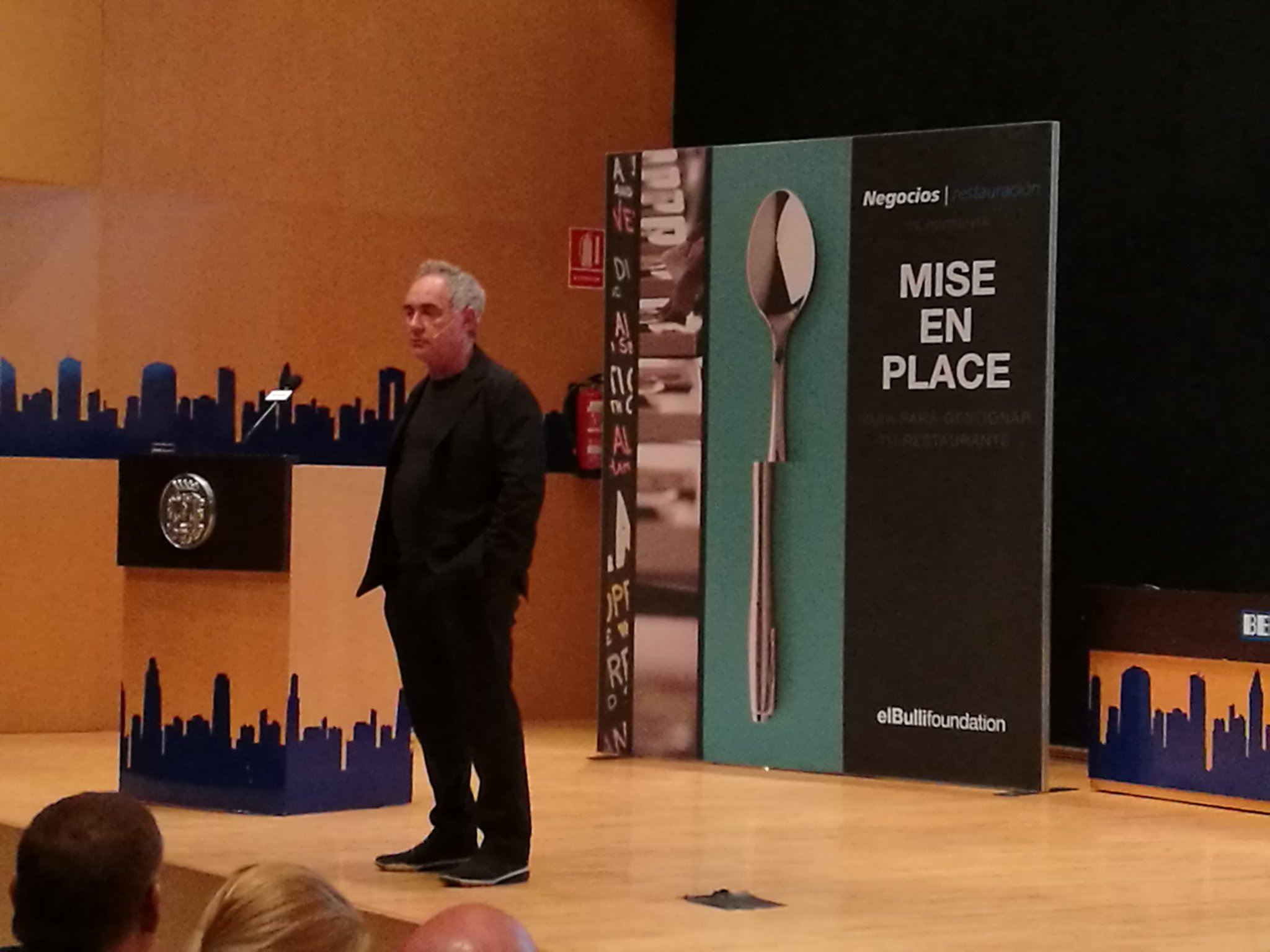 La esperada intervención de Ferran Adrià dio inicio con un breve repaso a su trayectoria. Nos contó qué había hecho en su vida profesional y trazó una breve línea hasta llegar al presente. Enseguida pidió voluntarios entre el público: una persona con un negocio de restauración y otra con la idea de ponerlo en marcha. Esta dialéctica con las personas seleccionadas sirvió para articular dos procesos a la vez: por un lado, una metareflexión del “restaurante”, por otro lado, una especie de mentoring con las preguntas y cuestiones que se debe plantear cualquier persona emprendedora en el mundo de la restauración.