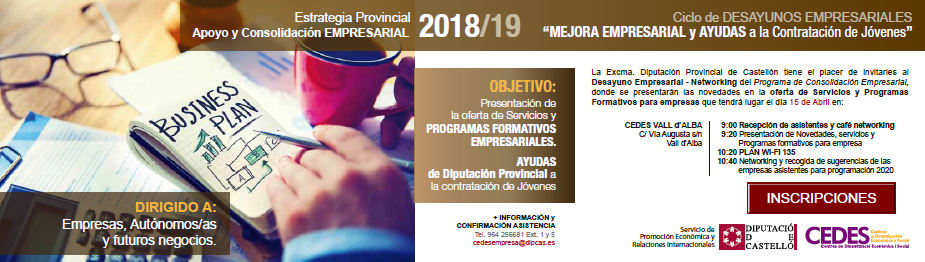 Desde la Diputación de Castellón queremos invitarle al Desayuno empresarial - Networking donde, además de aprovechar el espacio para conversar e intercambiar contactos profesionales con otras empresas, les presentaremos las novedades en la oferta de servicios y de cursos gratuitos para empresas que podemos ofrecerle desde los Centros CEDES para Pymes, autónom@s y profesionales de la provincia.