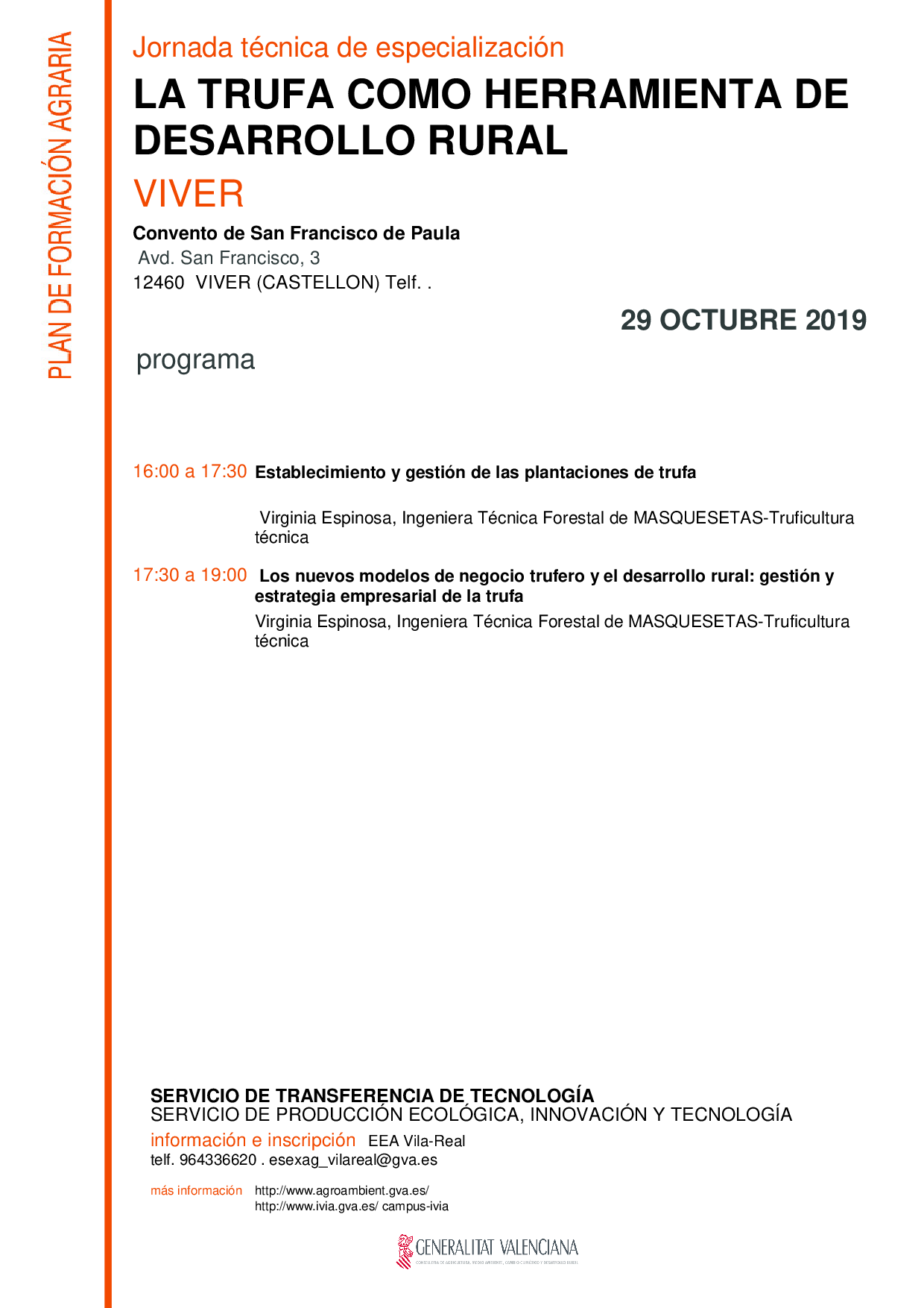 La Conselleria d'Agricultura, a través de la Estación Experimental Agraria de Vila-real. perteneciente al Servicio de Transferencia de Tecnología, organiza esta Jornada sobre la trufa, centrada fundamentalmente en su comercialización y en la generación de nuevas ideas de negocio relacionadas con la trufa, contando para ello con la intervención de una especialista de dilatada experiencia en la trufa, precedida de un técnico de la Generalitat Valenciana especializado en comercialización agroalimentaria, y terminando con la realización de una mesa redonda.