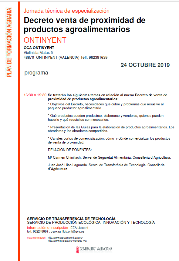 La Conselleria d'Agricultura, a través de las Estaciones Experimentales Agrarias de Vila-real y Llutxent, pertenecientes al Servicio de Transferencia de Tecnología, organiza esta Jornada sobre el nuevo Decreto del Consell de Venta de Proximidad de productos primarios y agroalimentarios, contando para ello con la intervención de una de las redactoras de dicho Decreto, además de un técnico de la Conselleria de Agricultura especializado en comercialización.