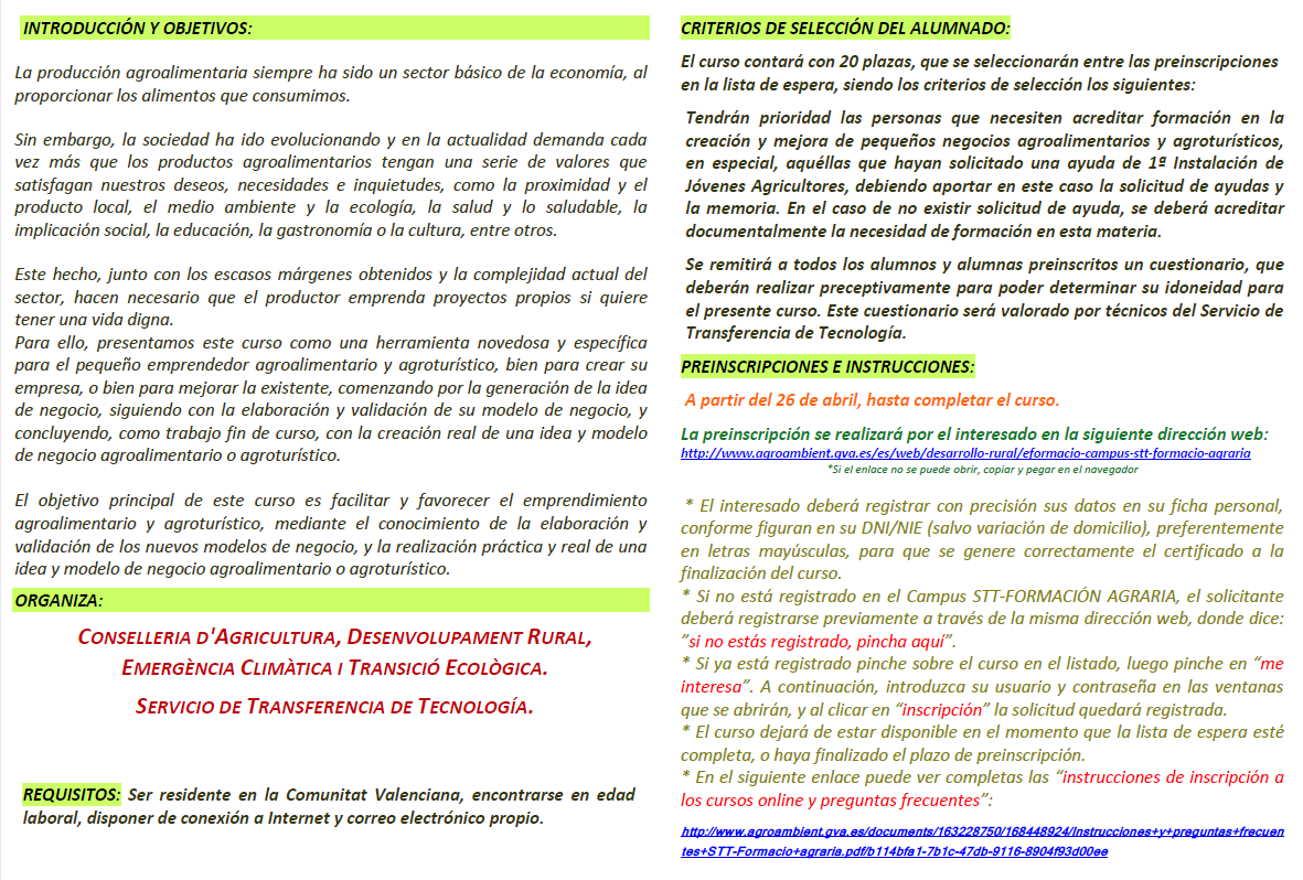 La Conselleria de Agricultura, Desarrollo Rural, Emergencia Climática y Transición Ecológica, a través del Servicio de Transferencia de Tecnología, presenta este curso tutorizado de carácter práctico como una herramienta novedosa y específica para el pequeño emprendedor agroalimentario y agroturístico, bien para crear su empresa, o bien para mejorar la existente, comenzando por la generación de la idea de negocio, siguiendo con la elaboración y validación de su modelo de negocio, y concluyendo, como trabajo fin de curso, con la creación real de una idea y modelo de negocio agroalimentario o agroturístico.