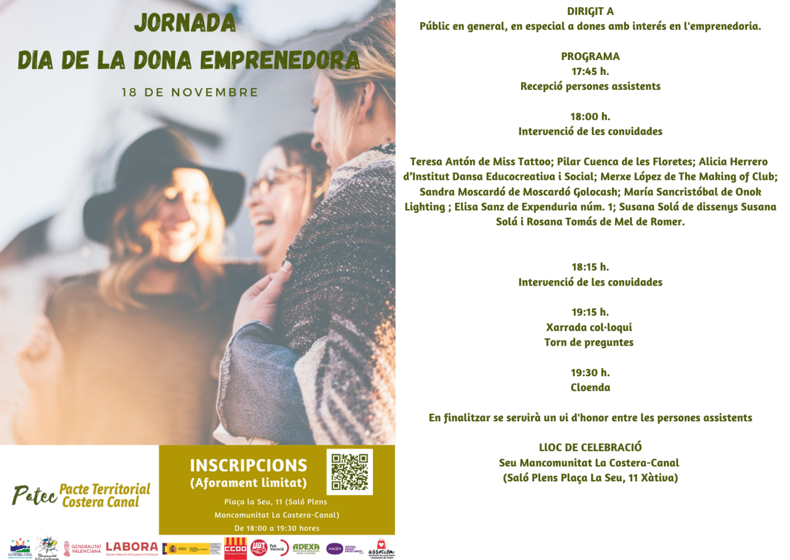 Con motivo del Dia de la Mujer Emprendedora, el Pacte Territorial conmemorará la tarde del jueves 18 de noviembre a las 18h en el salón de plenos de la Mancomunitat La Costera-Canal, la I Jornada de la Mujer Emprendedora. Este evento está dirigido al público en general y a las mujeres con interés en el emprendimiento en particular.