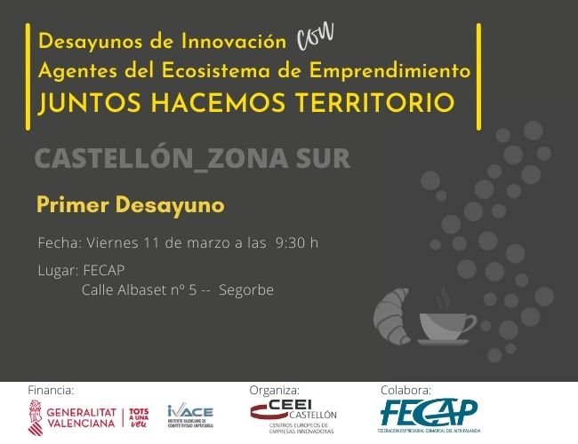 Desayuno de innovación en Segorbe, con los Agentes del Ecosistema de Emprendimiento de la zona sur de Castellón, para compartir y poner en común las líneas a trabajar durante el 2022 y confeccionar conjuntamente un programa de acciones encaminadas a recuperar y fortalecer el tejido empresarial de la provincia de Castellón.