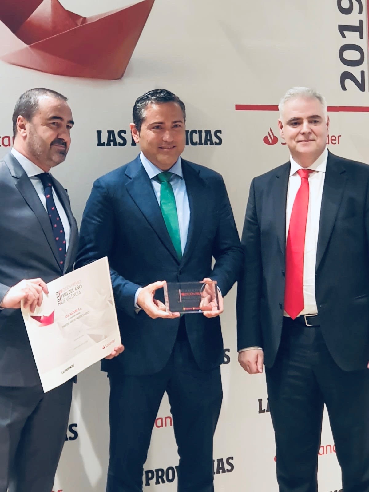 La empresa Idai Nature ha recibido el premio Pyme del Año 2019 en Valencia, organizado anualmente por la Cámara de Comercio y el Banco Santander, de mano Jose Luis Coll, Director de apoyo a la red de Cámaras de España.