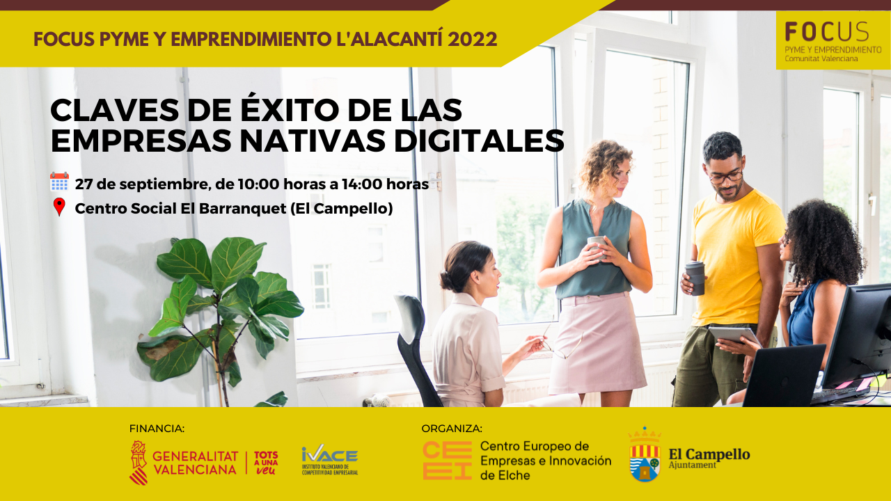 El evento Focus Pyme y Emprendimiento L´Alacantí 22, tendrá como protagonistas principales a las empresas nacidas digitalmente en la comarca, partiendo de cuál es su realidad tecnológica y los retos que se plantean en su actividad diaria. Además, mostraremos las estrategias para emprender digitalmente y los modelos de negocio que mejor funcionan, conociendo de primera mano empresas Nativas Digitales que han sido capaces de adelantarse a los cambios necesarios en la propia definición de su operativa.