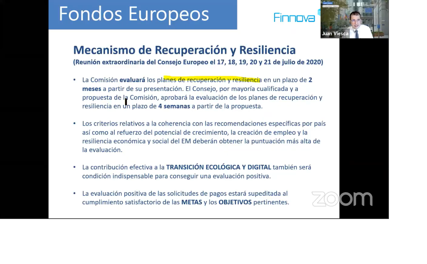 Con motivo de la jornada 'Fondos Europeos 2021-2027 para el desarrollo territorial'Juan Viesca, Director de Fondos Europeos de la Fundación Finnova ha dado a conocer hoy las oportunidades que ofrece Europa a los municipios gracias al plan de recuperación propuesto por la Comisión Europea para paliar los efectos del coronavirus.