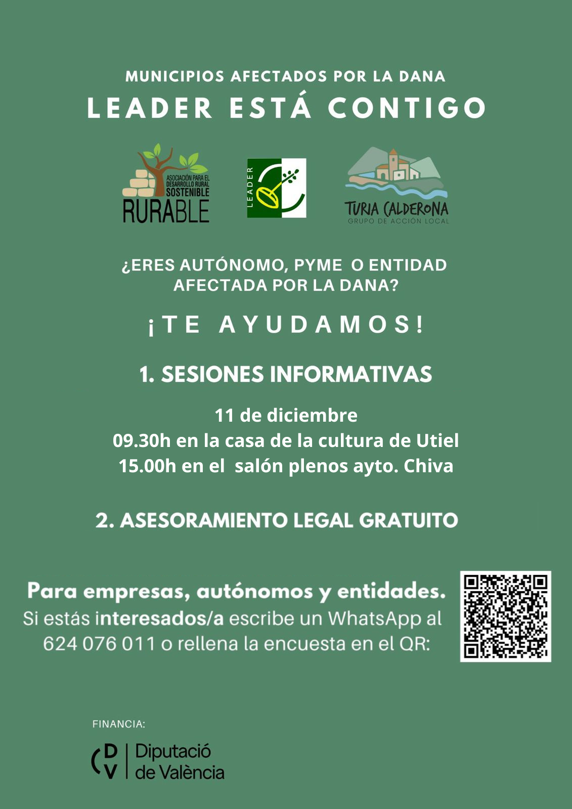 ¿Eres autónomo, pyme o entidad rural afectada por la DANA en nuestros municipios? Desde el GAL Turia Calderona y GAL Rurable, con el apoyo de la Diputación de Valencia, te ofrecemos acompañamiento gratuito para gestionar ayudas y trámites importantes.
