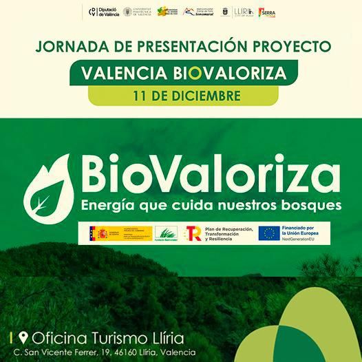 El Ajuntament de Llíria , la Mancomunitat Camp de Túria y sus socios colaboradores: Diputació de València Universitat Politècnica de València (UPV) , Mancomunidad del Interior Tierra del Vino, Ajuntament de Serra tienen el placer de invitarle a la presentación del proyecto "Valencia BioValoriza: prevención de incendios a través de la valorización de productos forestales".