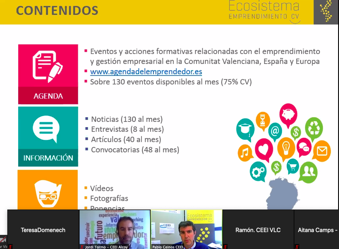 Esta mañana se han presentado, en una jornada online ante 40 agentes, las novedades que este año se incluirán en el Programa Online de Fortalecimiento para Agentes del Ecosistema Emprendedor de la Comunitat Valencia, dentro del convenio IVACE CEEI Alcoy-Valencia y en colaboración con Adlypse y Gridet-UV. Estas actuaciones están dirigidas principalmente a los agentes incluidos en el Mapa de Entidades y Servicios de Apoyo al Emprendimiento.