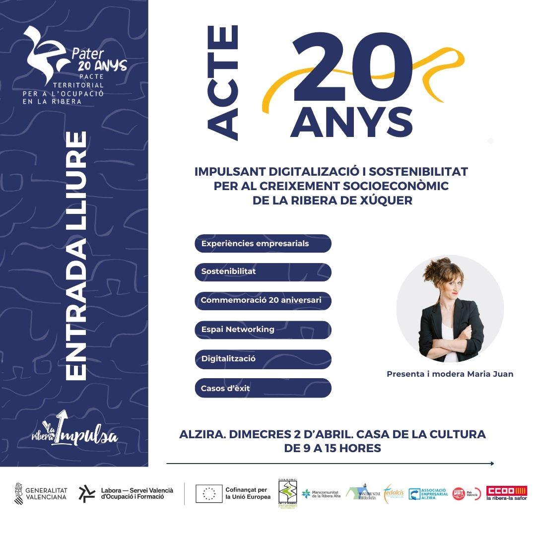 En el marco del 20 aniversario del PATER (Pacto Territorial por el Empleo en la Ribera), celebramos esta jornada con el objetivo de reflexionar sobre el papel clave de la digitalización y la sostenibilidad en el desarrollo socioeconómico de un territorio.
