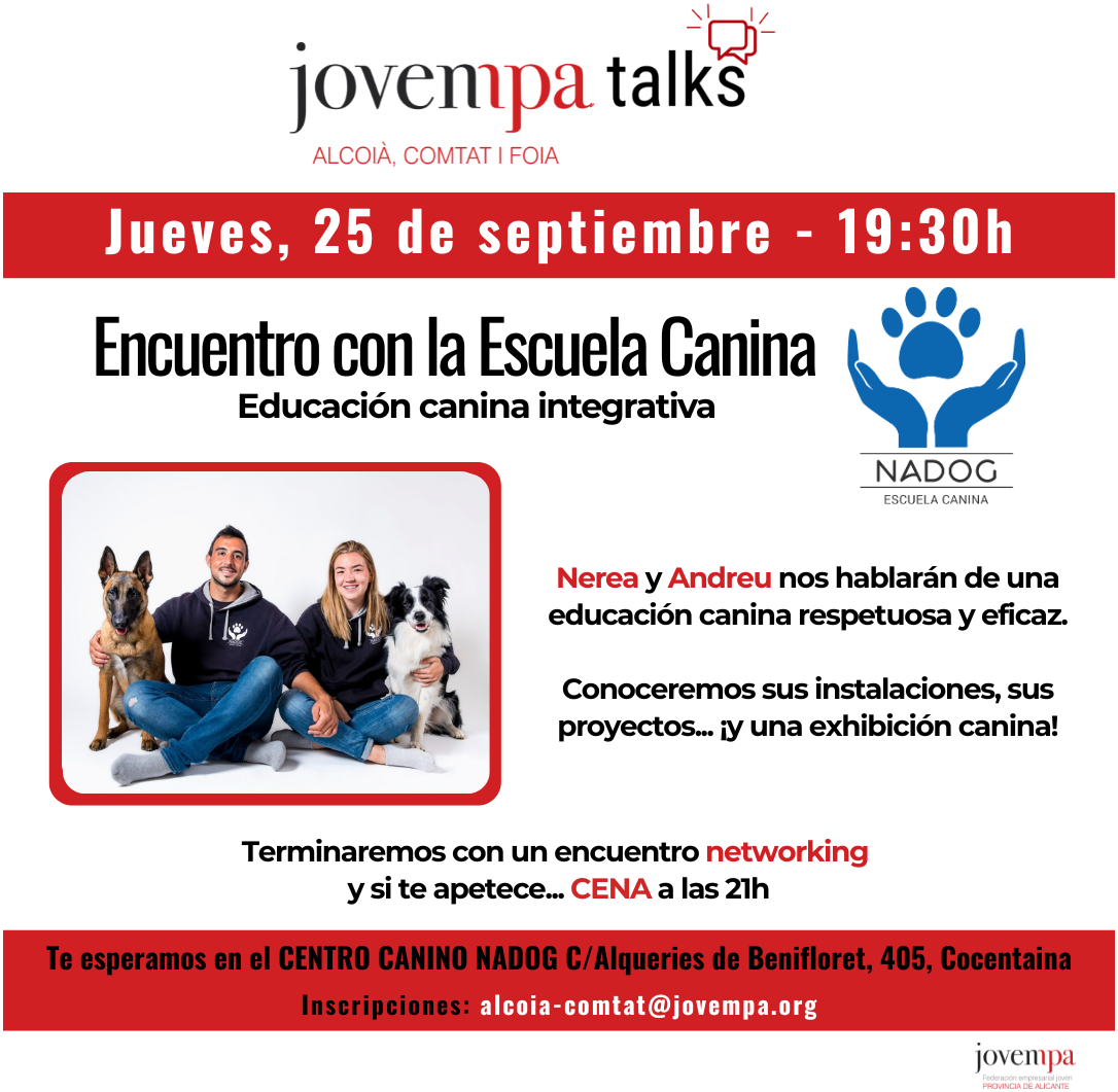 Con Nerea y Andreu , de la escuela canina Nadog, disfrutaremos de un encuentro de asociados muy especial. Nos contarán sus experiencias, proyectos,… y terminaremos ¡con una exhibición canina!