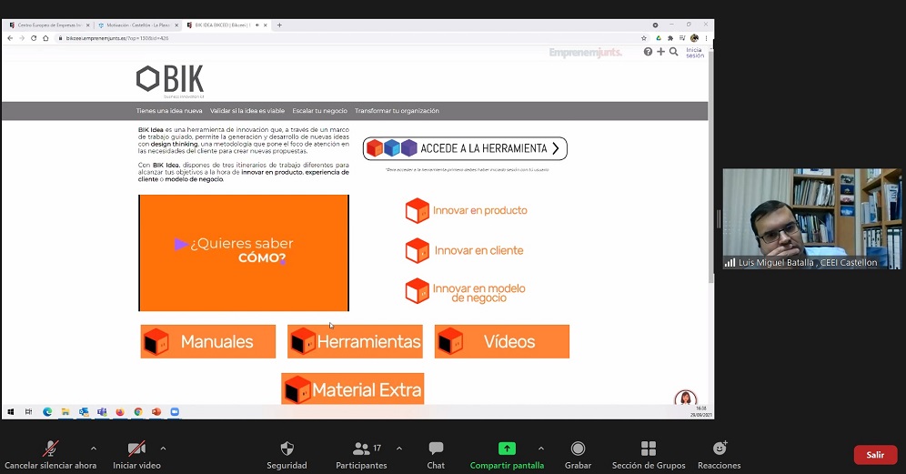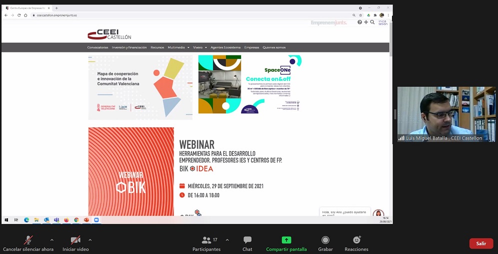 CEEI Castellón sigue difundiendo la metodología BIK (Business Innovation Kit) entre los diferentes públicos de interés de este programa coordinado por los CEEIs de la Comunitat Valenciana para proporcionar al ecosistema emprendedor valenciano instrumentos y herramientas de innovación desarrolladas y validadas por los propios CEEIs. Ayer miércoles, tuvo lugar un webinar dirigido específicamente a profesores del área de Economía y Empresa de los institutos de Educación Secundaria Obligatoria (ESO) y Formación Profesional (FP) de la provincia. En la sesión se pusieron sobre la mesa las cualidades de la metodología BIK y más en concreto, su alto grado de utilidad como contenido para el módulo de Empresa e Iniciativa Emprendedora (EIE), en el que se trabaja en diferentes aspectos del emprendimiento, desde el plan de empresa a herramientas como Canvas. En este punto, se incidió en el gran potencial de BIK por su despliegue de las herramientas más adecuadas en cada fase de un proyecto de emprendimiento, hasta el crecimiento y consolidación de una pyme. En el encuentro virtual, se puso a disposición de los y las docentes asistentes el gran abanico de recursos en torno a la metodología BIK, accesibles en diferentes formatos a través de las webs de CEEI Castellón y de la plataforma Emprenemjunts.