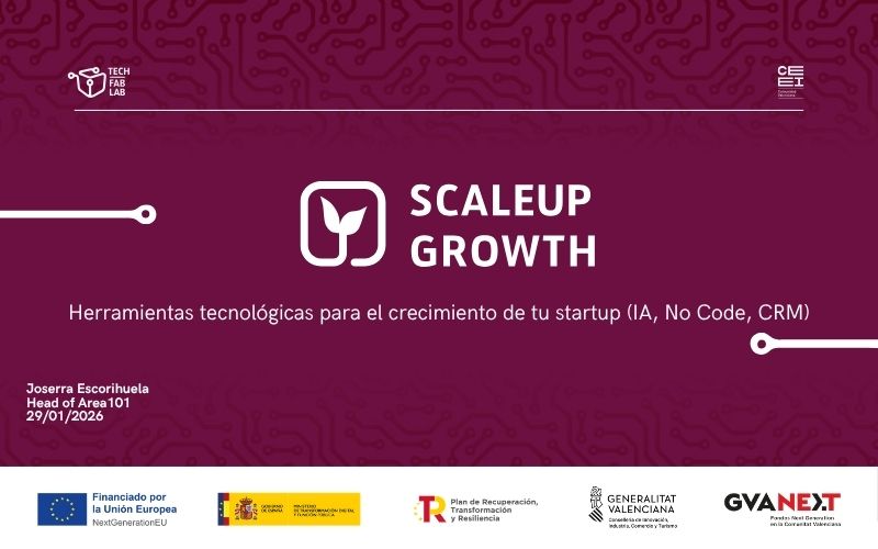 Scale Up Growth forma parte del proyecto Tech FabLab Comunicad Valencia, enmarcado en el proyecto RETECH (Redes Territoriales de Especialización Tecnológica), que fomenta proyectos de empresas tecnológicas basados en inteligencia artificial y otras tecnologías avanzadas. Los objetivos de Tech FabLab CV son promover el desarrollo empresarial en el ámbito de la innovación tecnológica, impulsar el crecimiento de scaleups en la Comunidad Valenciana y alentar la aparición de spin-offs corporativas en el panorama regional.