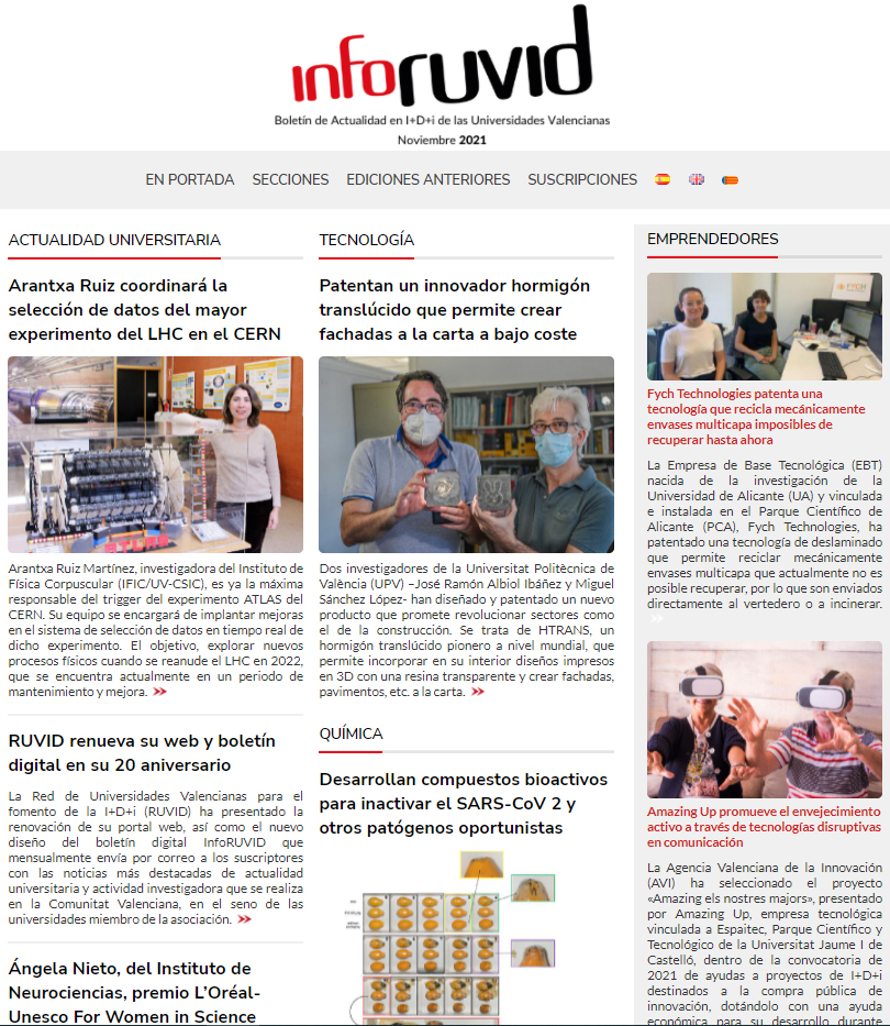 La Asociación Española de Científicos (AEC) ha otorgado la Placa de Honor 2021 al Anuario InfoRUVID y al boletín digital InfoRUVID, herramientas de comunicación de la Red de Universidades Valencianas para el fomento de la I+D+i (RUVID), «por su contribución desde 2007 a la difusión de la ciencia, la tecnología y la innovación realizada en las siete Universidades radicadas en la Comunitat Valenciana, habiéndose convertido en un referente de comunicación científica rigurosa y accesible a toda la sociedad», tal y como argumenta la AEC para su concesión.