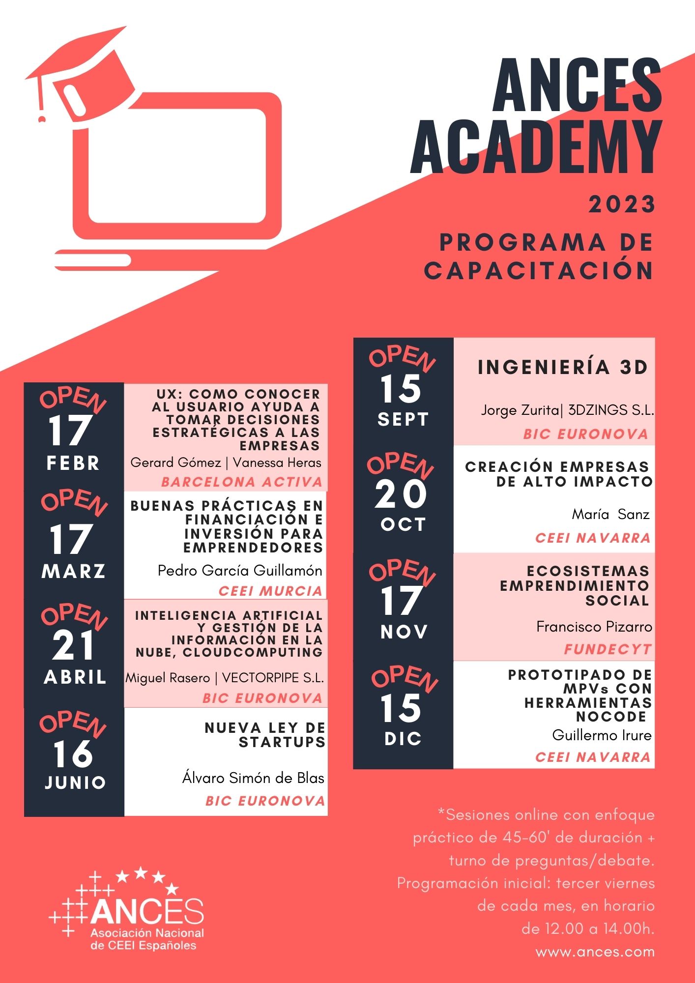 ANCES, la Asociación Nacional de CEEI Españoles,  ha lanzado una nueva edición de su ANCES Academy, una serie de webinars mensuales con temáticas tan diversas como: inteligencia artificial, cloud computing, ley de startups, ingeniería 3D, crecaión de empresas de alto impacto, herramientas NO CODE o Ecosistemas de emprendimiento social.