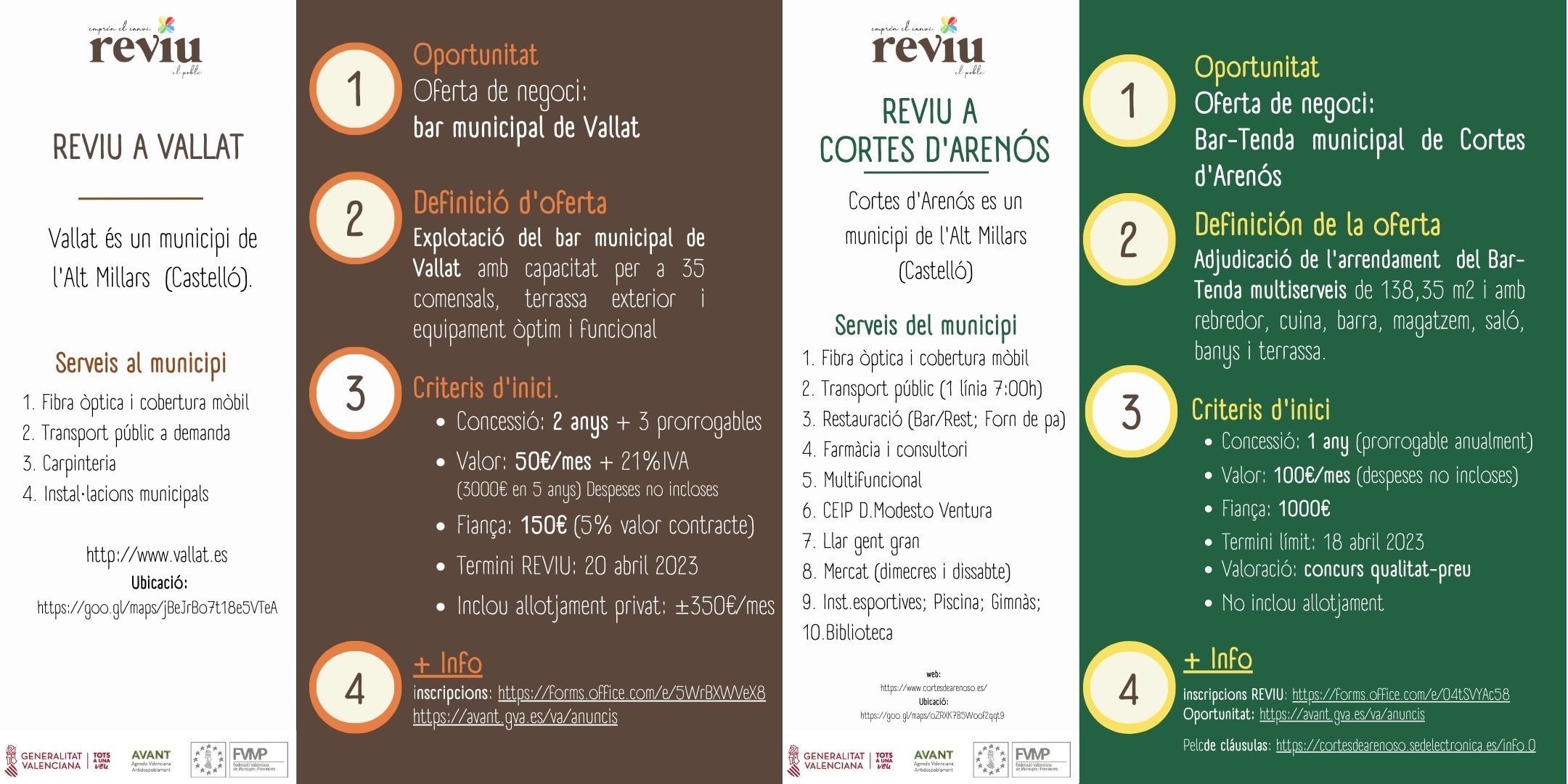 Els municipis de Vallat i Cortes d'Arenós, tots dos a la comarca de l'Alt Millars, liciten els seus respectius bar municipal i bar-tenda del municipi. Des d'AVANT-FVMP derivem i acompanyem famílies/candidatures per tal que puguen presentar ofertes a la Corporació local.