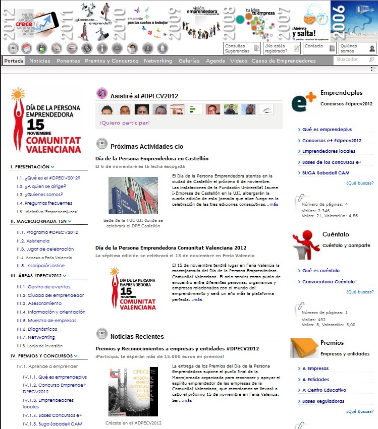 Para inscribirse en una Macrojornada, lo primero que hay que hacer es ir a la página de acceso a esa Macrojornada, una página que suele estar caracterizada por un Menú Especial, situado en la parte izquierda de la página (aunque podría estar a la derecha), y que le permitirá navegar por toda la información y contenidos de esa actividad. En el lateral de este registro, la primera imágen corresponde a la página principal (home) del Día de la Persona Emprendedora de la Comunidad Valenciana 2012.