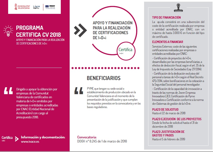 Concesión de subvenciones para la obtención por empresas de Comunitat Valenciana de certificados en materia de I+D+i emitidos por empresas o entidades acreditadas por ENAC (Entidad Nacional de Acreditación) con cargo al presupuesto 2018.