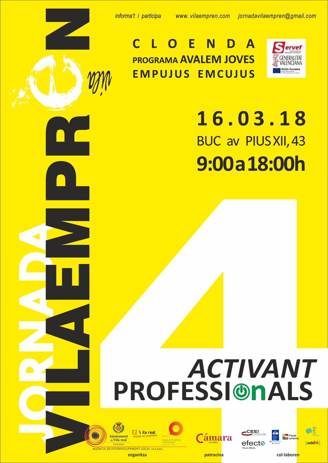 El Ayuntamiento de Vila-real organiza la 4 JORNADA VILAEMPRÈN (programa), la finalidad de la cual es promover y activar a los profesionales del programa AVALEM JOVES. Una jornada abierta y participativa para los jóvenes talentos de Vila-real y en la que los programas EMPUJUS Y EMCUJUS celebran su Clausura.