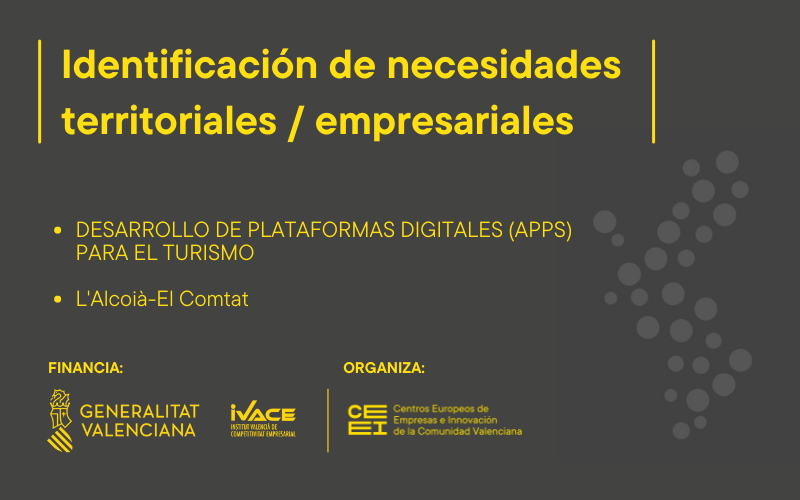 • Tecnología. Descubre l’Alcoià-Comtat: Aplicación tecnológica tipo APP, portal, etc., que personaliza su estancia, actividad y producto, según el perfil, disponibilidad y gustos del turista registrado en la aplicación.Se busca promover el turismo como un sector con potencial para este territorio.