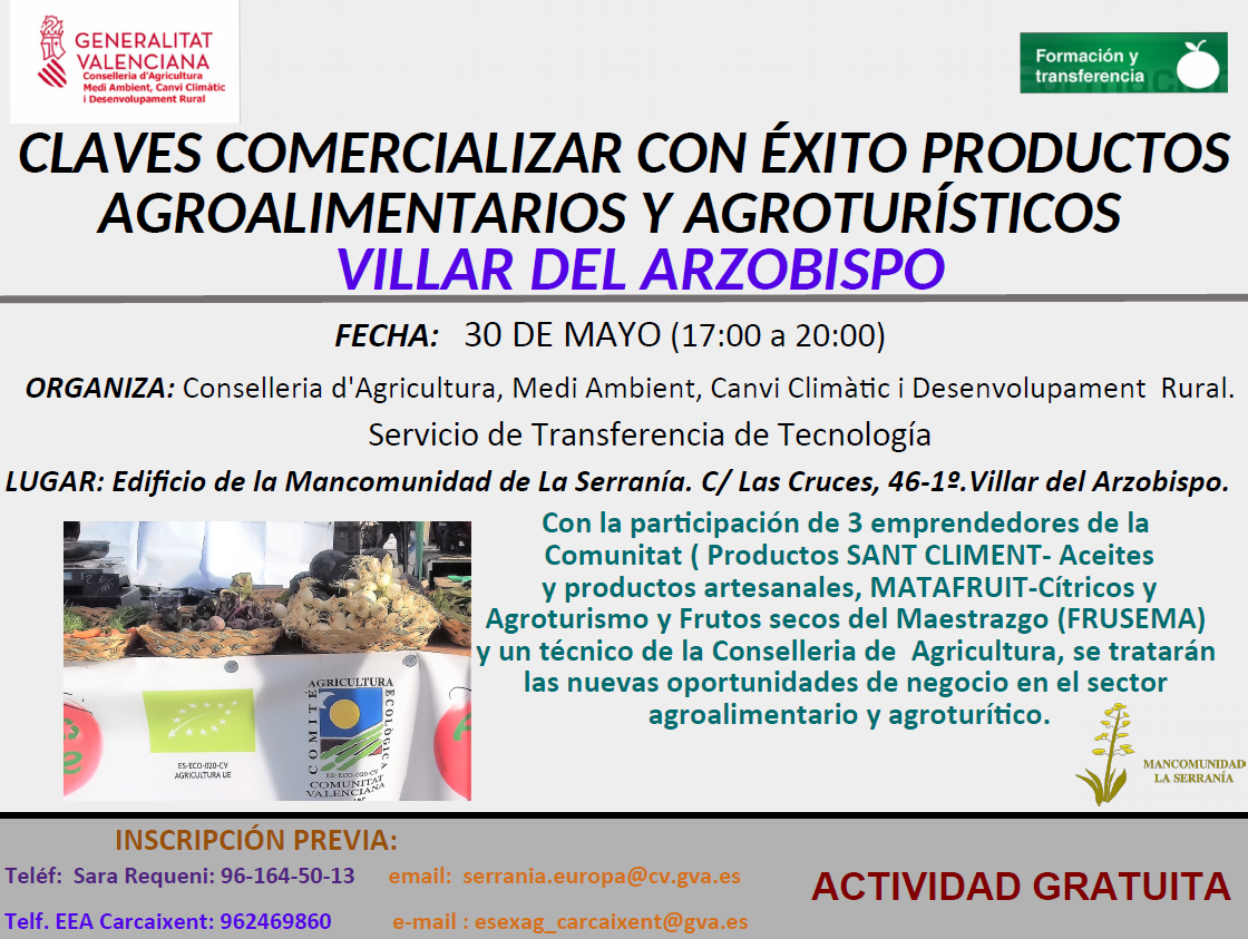 La Conselleria d'Agricultura, a través de las Estaciones Experimentales Agrarias de Vila-real y Carcaixent, pertenecientes al Servicio de Transferencia de Tecnología, y en colaboración con la Mancomunidad de La Serranía, organiza esta Jornada sobre comercialización de productos y servicios agroalimentarios y agroturísticos, contando para ello con la intervención de 3 jóvenes emprendedores agroalimentarios, además de un técnico de la Generalitat Valenciana especializado en estos temas, y terminando con una mesa redonda con la participación de los ponentes y los asistentes.