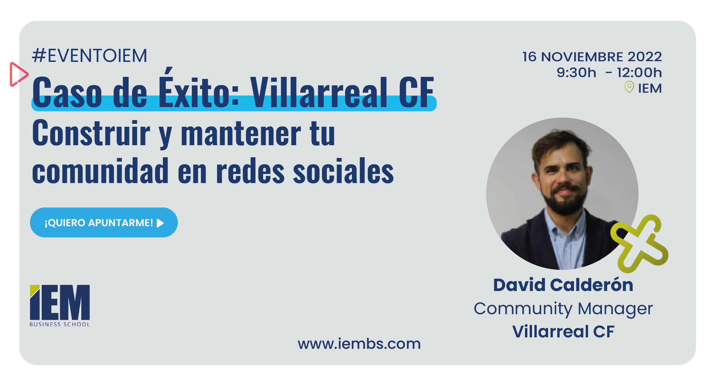 En el próximo #EventoIEM, David Calderón, Community Manager en Departamento de Prensa en Villarreal CF, contará la evolución de las redes sociales del gran club así como las estrategias de crecimiento y de comunidad que han llevado a cabo para ser a día de hoy uno de los grandes clubes en redes sociales.