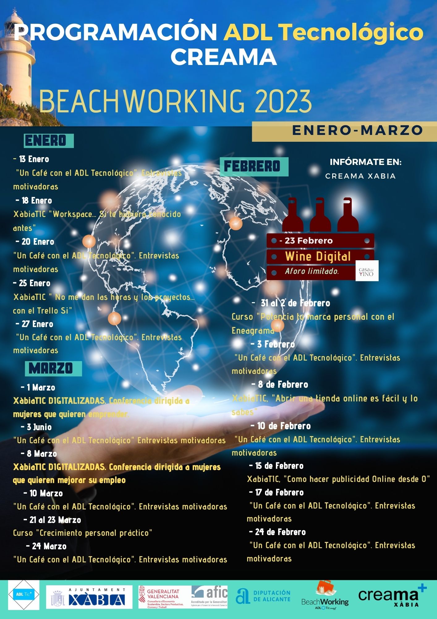 El programa arranca el 18 de enero con las conferencias XàbiaTIC donde se abordan diferentes temas de las Nuevas Tecnologías y las Herramientas de gestión. Destacan conferencias como "Workspace...Si te hubiera conocido antes” y “No me dan las horas y los proyectos... Con el Trello SI” los próximos 18 y 25 de Enero. Febrero comenzará con un curso impartido por el propio ADL Tecnológico sobre una herramienta de crecimiento personal que ayuda a nuestra propia marca. Será el turno de “Potencia tu marca personal con el Eneagrama”. Además los días 8 y 15 de febrero se hablará de "Abrir una tienda online es fácil y lo sabes","Como hacer publicidad Online desde 0" en las XàbiaTIC correspondientes.