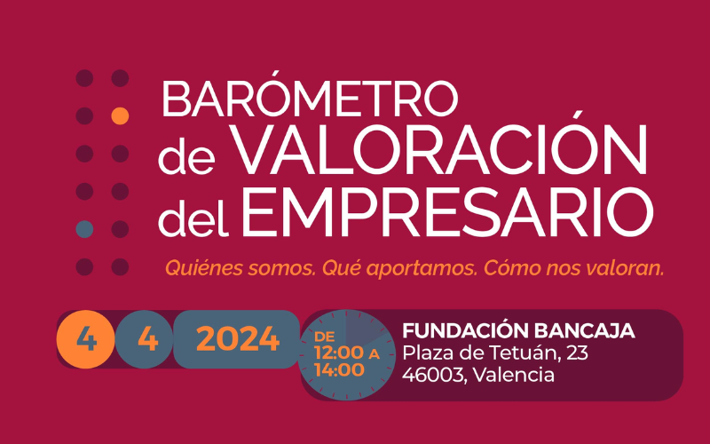 El próximo 4 de abril presentaremos los resultados de este año en un acto empresarial  en el que nos encantaría contar con su asistencia. La Asociación Valenciana de Empresarios (AVE) ha impulsado el 2º Barómetro de Valoración del Empresario, un proyecto nacional que busca conocer y reevaluar anualmente la opinión de la sociedad española sobre los empresarios y empresarias.