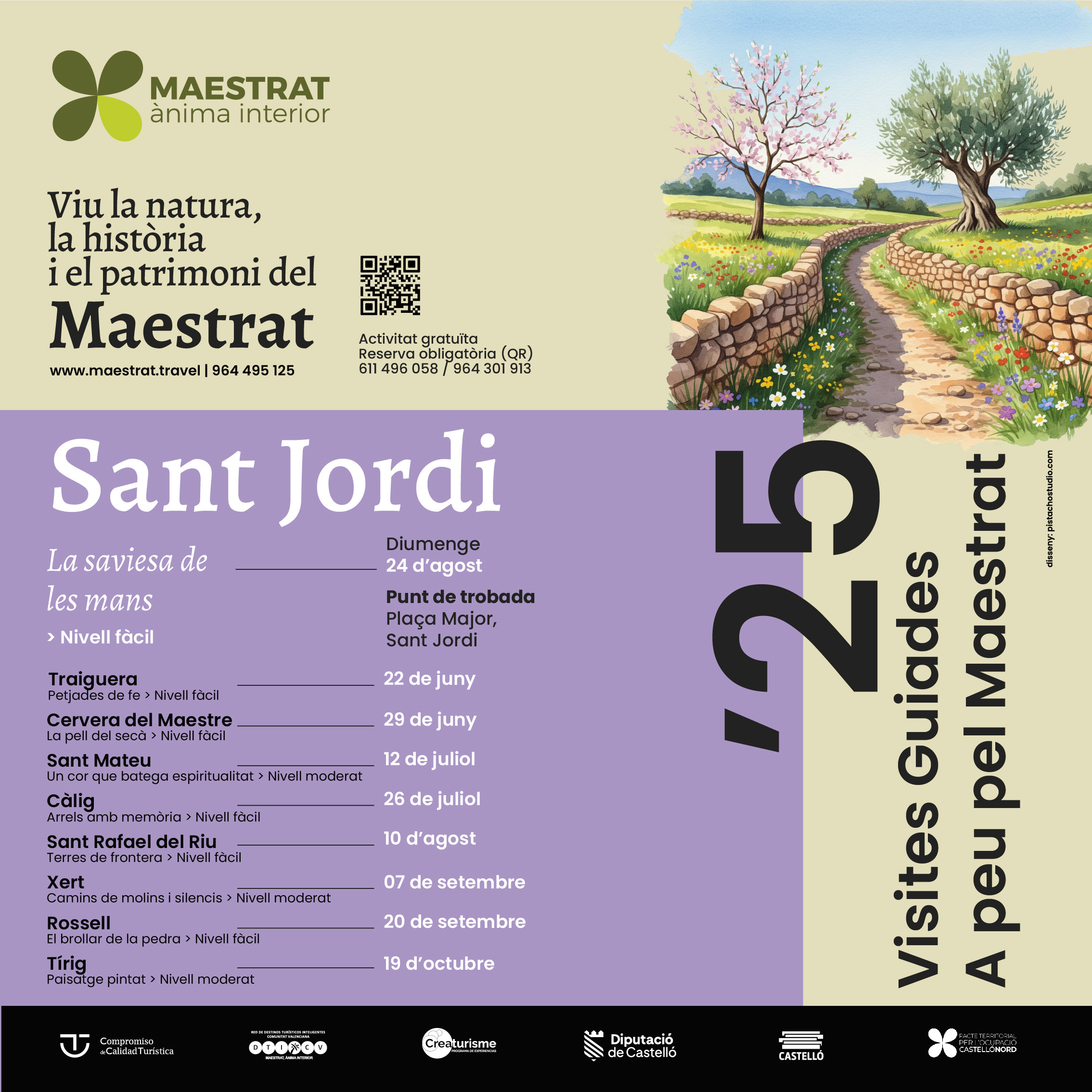 Situado en el interior próximo de la comarca, Sant Jordi conserva el encanto de los pueblos tranquilos con fuerte vínculo con su entorno. En esta ruta recorreremos el paraje natural municipal del Bovalar, donde descubriremos infraestructuras tradicionales vinculadas al mundo rural. Un paseo entre bosque mediterráneo y memoria rural que nos conecta con modos de vida ya casi desaparecidos.