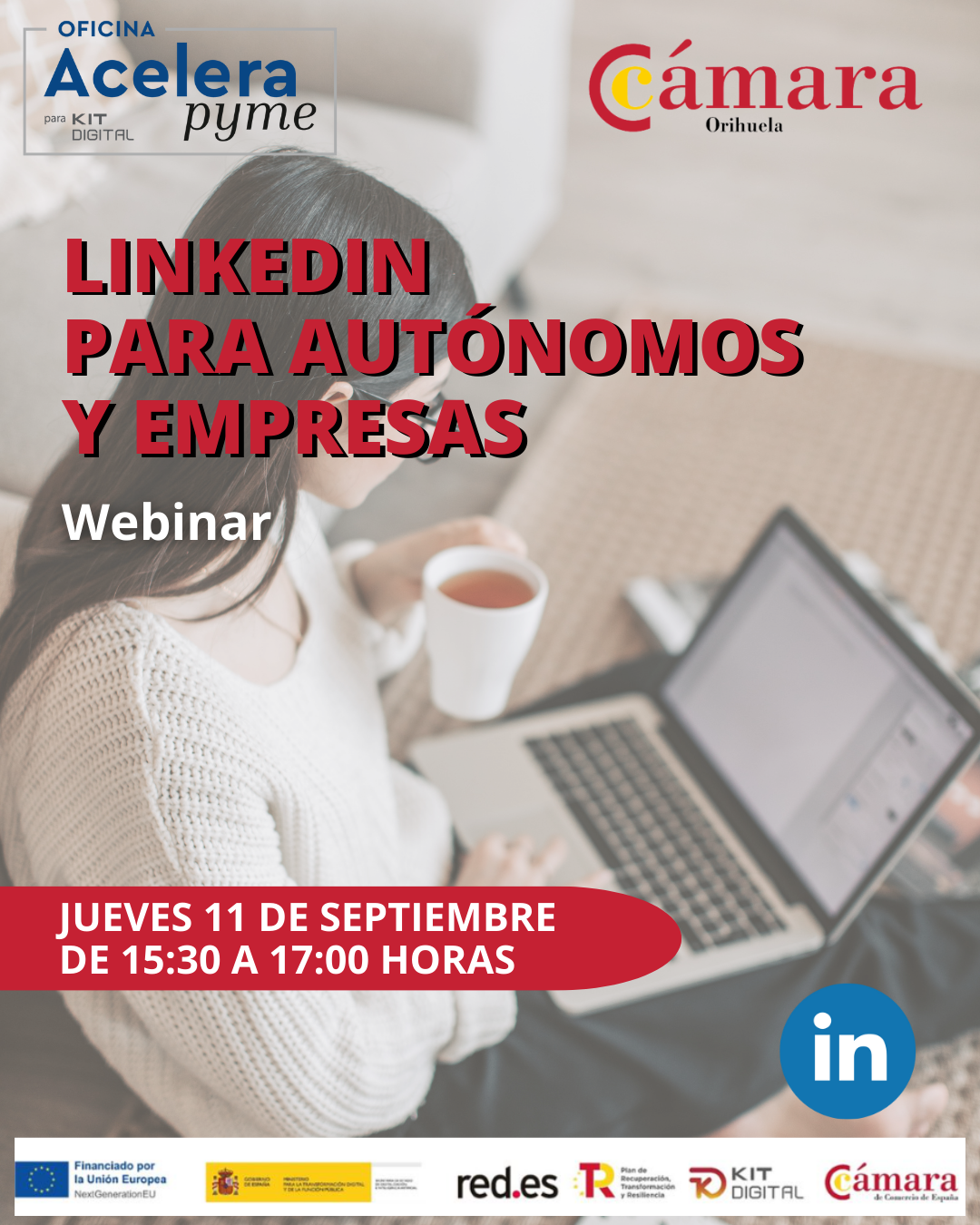 La Oficina Acelera Pyme de Cámara Orihuela os invita a participar en la formación on line LINKEDIN PARA AUTÓNOMOS Y EMPRESAS, en la que mostraremos, de forma práctica, las posibilidades de esta red como herramienta de visibilidad profesional, networking y posicionamiento de marca personal o empresarial.