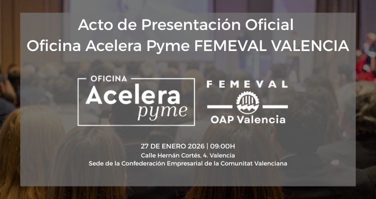 Presentación de la Oficina Acelera Pyme de FEMEVAL en Valencia, que tendrá lugar el 27 de enero, a partir de las 9h, en la sede de la Confederación Empresarial CV.