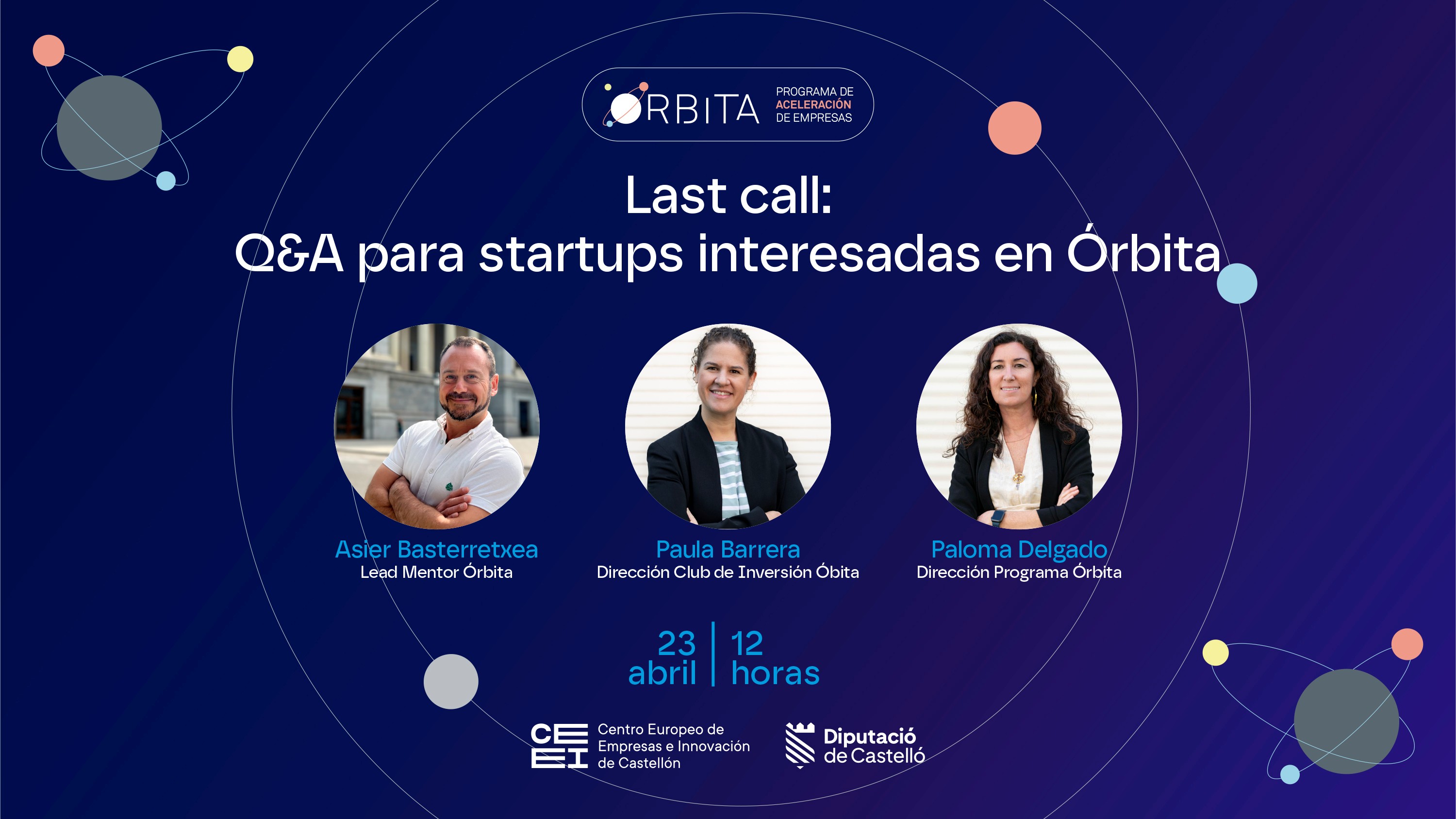 Si te has inscrito a esta edición y quieres conocernos mejor antes de entrar, o si estás pensando en inscribirte, no lo dudes y participa en esta sesión en la que Asier Basterretxea (Lead Mentor Órbita), Paloma Delgado (Dirección Órbita) y Paula Barrera  (Dirección Club de Inversión Órbita) resolverán las dudas que puedas tener y te mostrarán cómo es participar en Órbita.