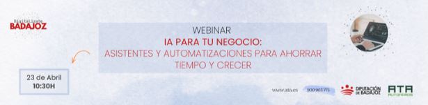 ATA Extremadura organiza un nuevo webinar centrado en la Inteligencia Artificial aplicada a autónomos, en el marco del proyecto Digitalízate Badajoz. La sesión será online y gratuita y se celebrará el próximo 23 de abril.