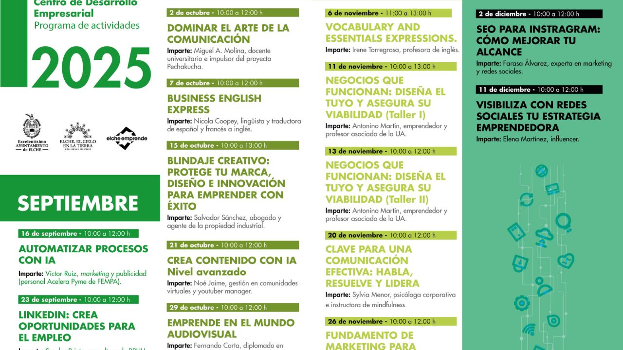 El programa comienza el próximo 16 de Septiembre y las acciones durarán hasta el 11 de diciembre, con varias actividades en septiembre, octubre, noviembre y diciembre. Los interesados ya pueden inscribirse desde el portal web del Centro de Desarrollo Empresarial de Elche.