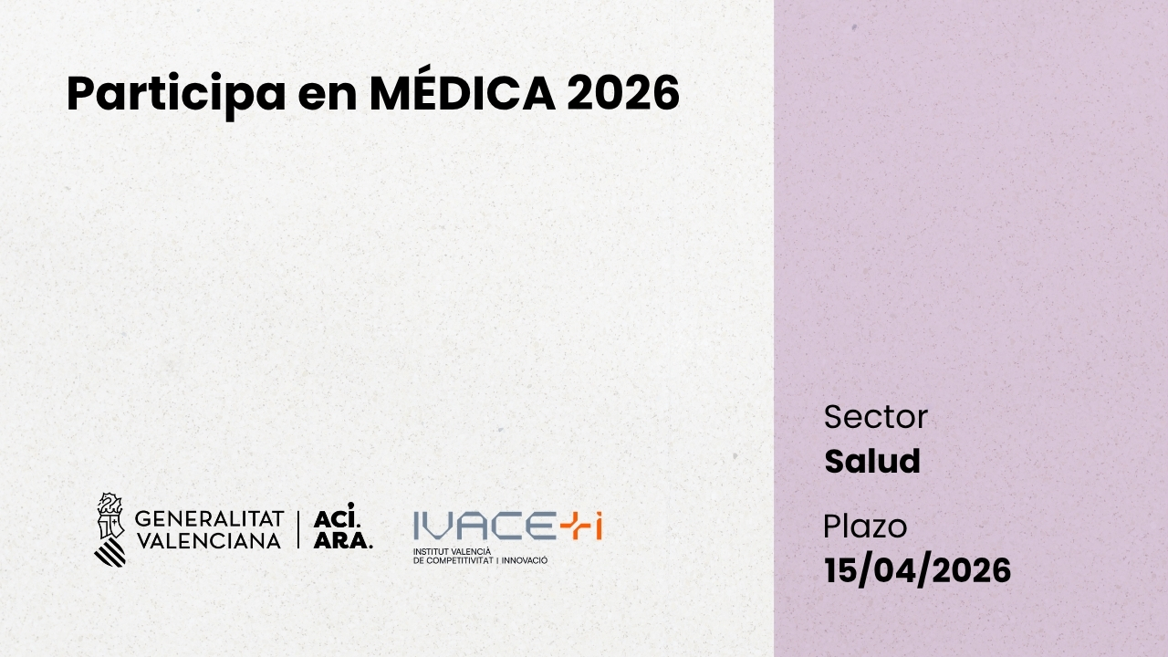 IVACE Internacional organiza la participación de empresas tecnológicas y Startups dirigidas al sector salud, en la feria MÉDICA, que tendrá lugar del 16 al 19 de noviembre de 2026 en Düsseldorf, Alemania, bajo el paraguas de la Federación Española de Empresas de Tecnología Sanitaria (FENIN).